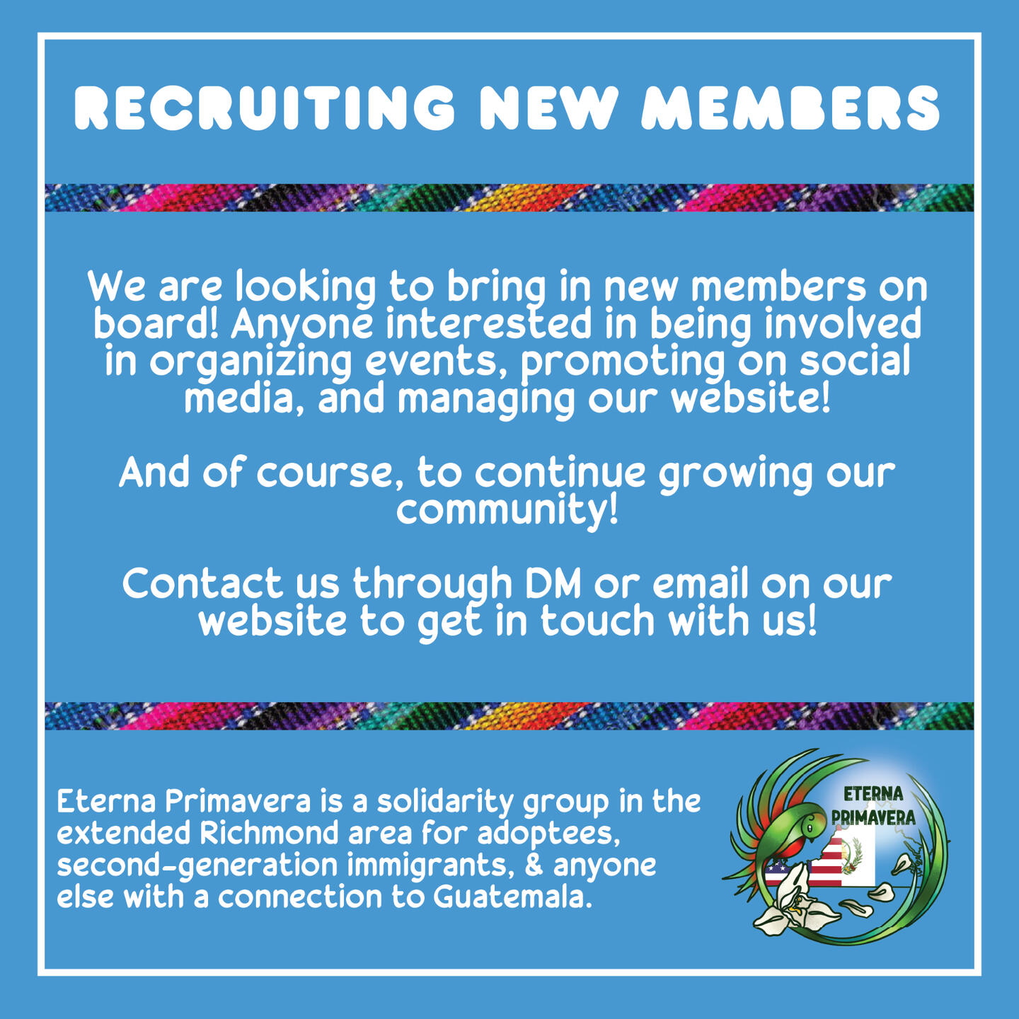 This group was created to bring together first and second gen Guatemalan Americans throughout Virginia. We hope to keep this a space mainly for Guatemalans but if you still would like to get involved please reach out!